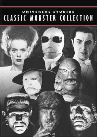 DVD cover showing characters made famous by Universal Studios. Elsa Lanchester from Bride of Frankenstein (1935), Claude Rains from The Invisible Man (1933), Bela Lugosi from Dracula (1931), Claude Rains from Phantom of the Opera (1943), "The Creature" from Creature from the Black Lagoon (1954), Boris Karloff from Frankenstein (1931), Lon Chaney Jr. from The Wolf Man (1941) and Boris Karloff from The Mummy (1932)