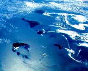 View east across the Canary Islands. La Palma is on the bottom left. Tenerife is near the center as seen in the Shuttle photo above. The coast of Africa forms the horizon. Volcanism in the Canary Islands is associated with the transition from continental (Africa) to oceanic (Atlantic) lithosphere within the Africa plate, the effects of the tectonics of the nearby Atlas Mountains, and the very slow movement (about 1 cm per year for the last 60 million years) of the African plate (see references in Carracedo, 1994).